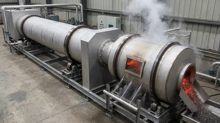 In einem elektrischen Drehrohrofen wird das Material nach der Entladung indirekt mithilfe eines speziellen Trommelkühlers gekühlt. Dieses Gerät, das vom Hauptheizofen getrennt ist, besprüht die Außenseite seiner rotierenden Ummantelung mit Wasser. Das heiße Material taumelt im Inneren und überträgt seine Wärme durch die Metallwand auf das Wasser, das dann verdampft, wodurch die Materialtemperatur auf das erforderliche Niveau gesenkt wird, ohne dass ein direkter Kontakt mit dem Kühlmedium stattfindet.