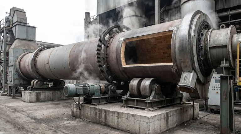 Im Kern ist ein Drehrohrofen ein integriertes System zur Hochtemperatur-Materialverarbeitung. Zu seinen wichtigsten strukturellen Komponenten gehören der zylindrische Stahlmantel, die schützende innere feuerfeste Auskleidung, die Antriebseinheit, die die Rotation ermöglicht, und ein robustes Stützsystem, das aus Tragringen und Rollen besteht und die immense Last trägt. Diese Elemente arbeiten zusammen, um Materialien in einem kontinuierlichen, kontrollierten Prozess zu transportieren, zu erhitzen und umzuwandeln.
