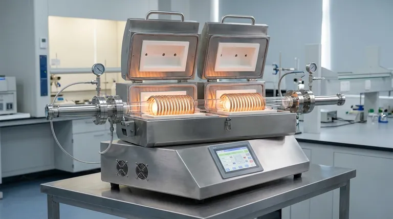 Mit außergewöhnlicher F&E und eigener Fertigung bietet KINTEK vielfältigen Laboren fortschrittliche Hochtemperatur-Ofenlösungen. Unser Zwei-Zonen-Röhrenofen ist nur ein Beispiel unserer Produktlinie, die Muffel-, Röhren-, Drehrohröfen, Vakuum- und Atmosphärenöfen sowie CVD/PECVD-Systeme umfasst. Unsere starke Anpassungsfähigkeit ermöglicht es uns, Ihre einzigartigen experimentellen Anforderungen präzise zu erfüllen, egal ob Sie eine erweiterte gleichmäßige heiße Zone oder einen komplexen thermischen Gradienten benötigen.