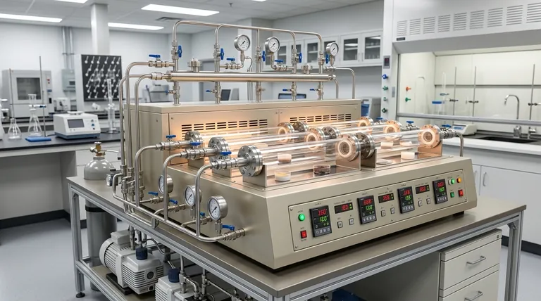 Das entscheidende Merkmal eines Mehrstations-Vakuumrohrofens ist sein einzigartiges Verbindungssystem, das es ermöglicht, mehrere unabhängige Probenrohre von einer einzigen Zentraleinheit zu steuern. Dieses Design ermöglicht die gleichzeitige Durchführung mehrerer Hochtemperaturversuche, jeder mit seiner eigenen präzise gesteuerten Atmosphäre, die von einem Hochvakuum bis hin zu verschiedenen Schutz- oder Reaktivgasen reichen kann.