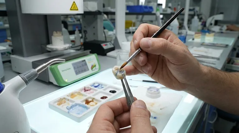Der Kernprozess der Individualisierung einer Restauration umfasst die Reinigung der Keramik, das Auftragen einer gleichmäßigen Schicht Glaze-Paste und das anschließende strategische Platzieren von Farben in die ungebrannte Glasur, um natürliche Zahneigenschaften vor dem abschließenden Brand nachzuahmen. Dies verwandelt einen monolithischen Keramikblock in eine Restauration, die sich nahtlos in das vorhandene Gebiss des Patienten integriert.